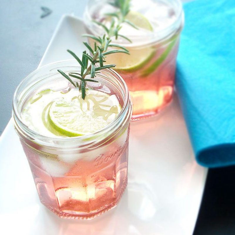 1. In a glass or jar pour the Seltzer water halfway up, then pomegranate syrup, orgeat syrup, and lime juice. Add ice cubes, a sprig of rosemary, and a few slices of lime.