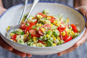1. Toss quinoa, avocado, tomato, basil, cilantro, and chopped almonds in a large salad bowl.