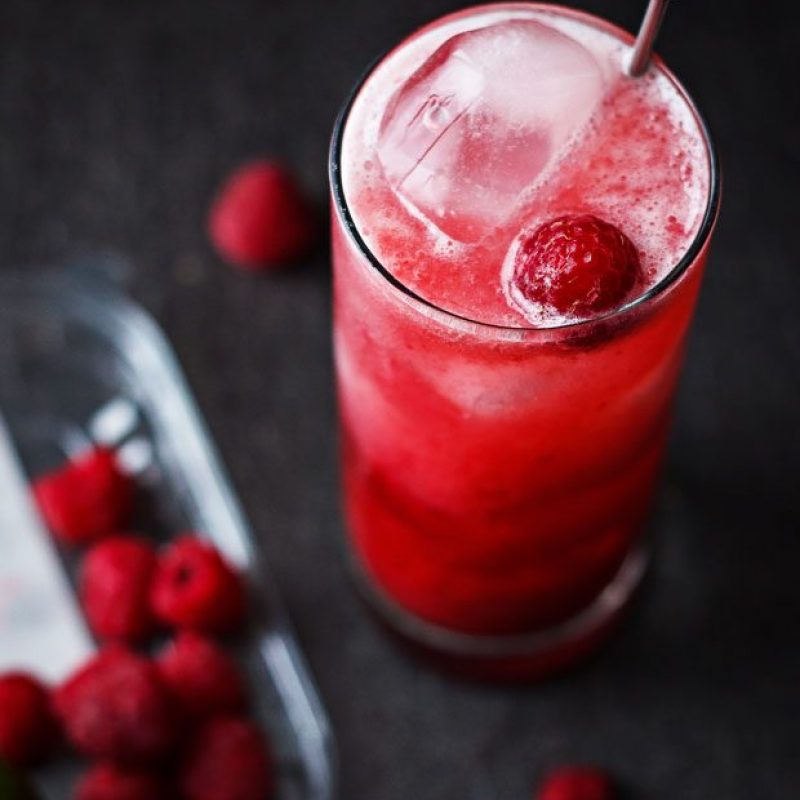2. Pour into glasses over ice, fill with sparkling water or Sprite, garnish with a raspberry, and serve the raspberry margarita immediately.