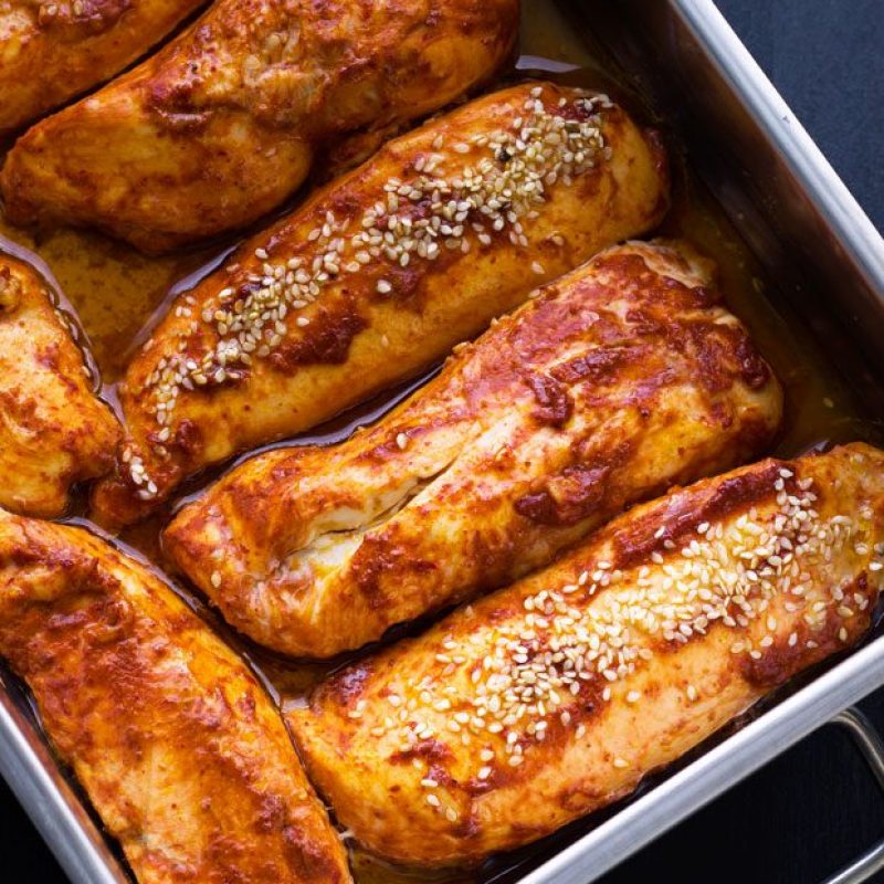 You only need five ingredients to create these spicy, healthy, low-calorie roasted chicken breasts with delightful oriental accents. Coated in a fragrant spicy hot sauce, healthy chicken breasts come out incredibly moist and tender, topped with the crunch and the nutty flavor of toasted sesame. The best thing is that oven-roasted chicken breasts are ready in less than 20 minutes! Still don’t know what to eat for dinner tonight?