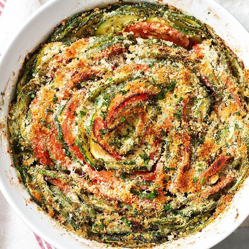 3. Arrange zucchini and tomatoes in the prepared baking dish, forming a spiral into an even layer. Season with salt and pepper. Sprinkle Parmesan over the top.