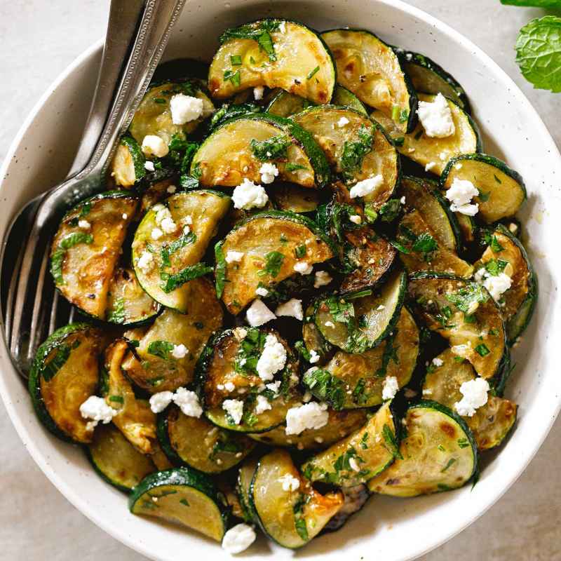 3. Transfer zucchini into a salad bowl and sprinkle with salt, feta cheese, and chopped mint. Pour the Italian dressing over the roasted zucchini salad and mix well. Refrigerate until chilled and serve. Enjoy!