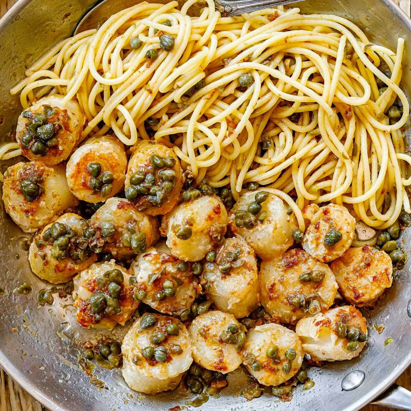 4. Toss the cooked pasta in the caper butter sauce, then divide into plates. Top it with the scallops and the remaining caper butter sauce. Serve the pan-seared scallops and pasta immediately with the caper butter sauce, garnished with parsley. Enjoy!