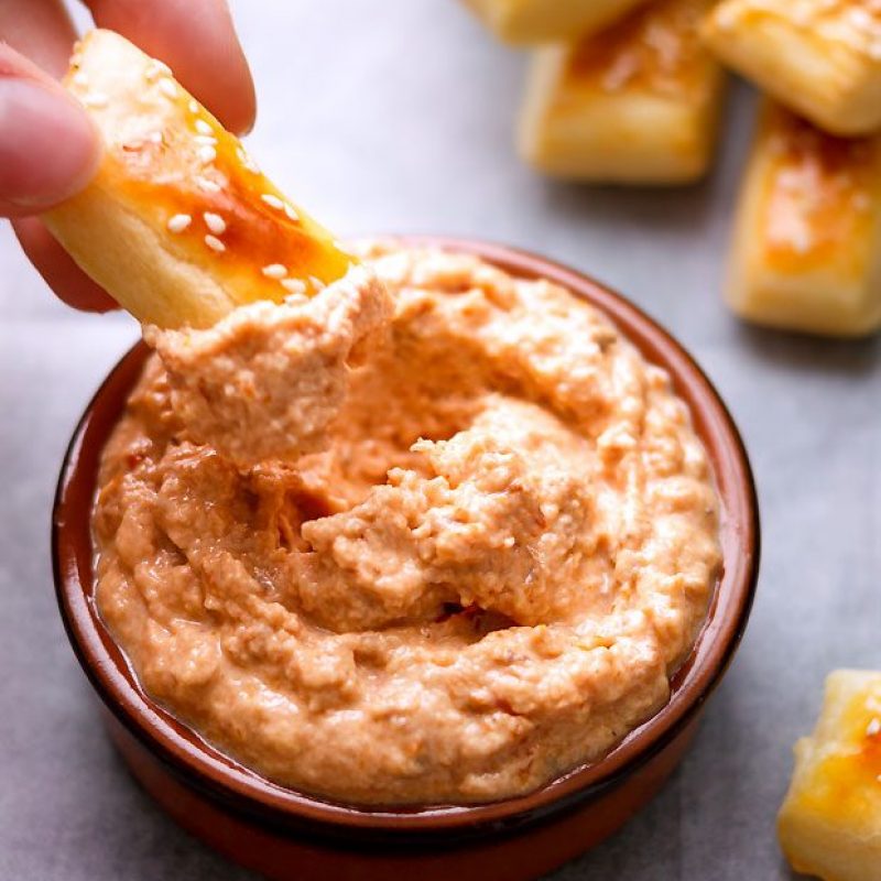The perfect appetizer for your end-of-summer backyard parties! Serve this fabulously creamy sun-dried tomato dip with homemade sesame puff sticks for a crisp touch.
