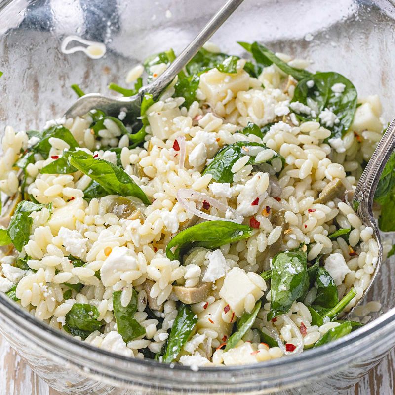 Orzo Pasta Salad Recipe with Feta and Spinach – This light and refreshing orzo pasta salad with feta, spinach, shallot, and cheddar is perfect for lunch or a potluck. It’s quick and easy to make, and it’s vegetarian so that everyone can enjoy it on its own or as a fabulous side for a picnic or a party! The combination of orzo, spinach, cheese, and a light but flavorful olive oil and lemon dressing makes this orzo pasta salad a delicious, healthy lunch option everyone will love!
