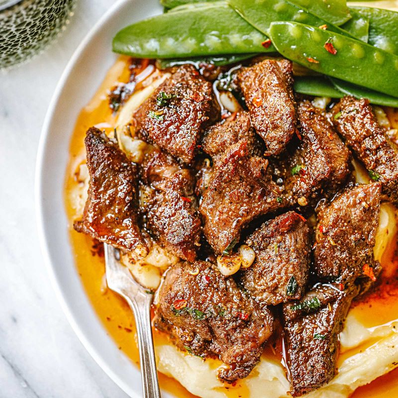 If you have any leftover steak bites (seriously?), allow them to cool to room temperature before storing in an airtight container for up to 3 days in your refrigerator. To reheat the steak bites, warm them up in a cast-iron skillet or an air fryer. Keep the mashed potatoes separate in another airtight container – to reheat, quickly run in the microwave.