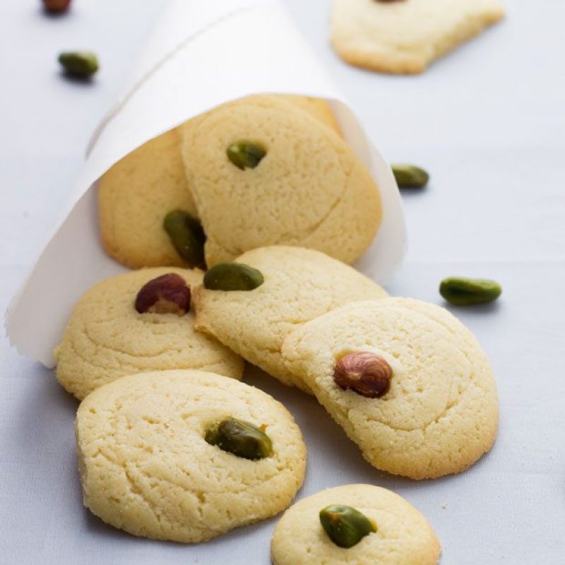 4. Spoon the dough on a baking sheet lined with parchment paper (cookies will flatten during baking). Top with a pistachio or a hazelnut.