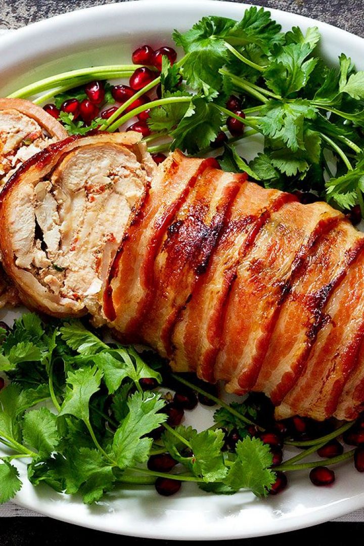 Roasted Bacon Chicken Stuffed with Dried Tomatoes and Cheese