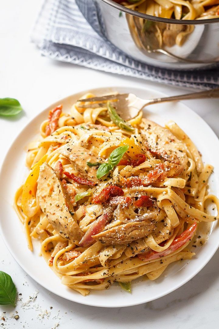 Chicken Pasta in Creamy Pesto Sun-Dried Tomato Sauce