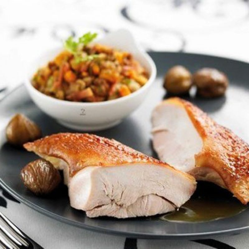 Hadn’t planned on hosting this year? Don’t let that stop you because there’s still time to cook and put together a fantastic, last-minute meal. This easy stuffed turkey recipe makes the most of turkey and its trimmings, so you won’t have to run outside to buy a lot of stuff. The combination of pork meat, bacon fat and chestnuts makes an incredibly flavorful stuffing, that stands for a side dish on its own. If you attend a smaller gathering, just use turkey breasts and roast the stuffing separately.