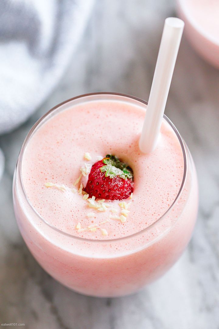 3. Pour the vanilla strawberry milkshake into the cold glass you prepared at step 1 and top with a strawberry or any topping of your choice. We like adding some shredded coconut. Enjoy!