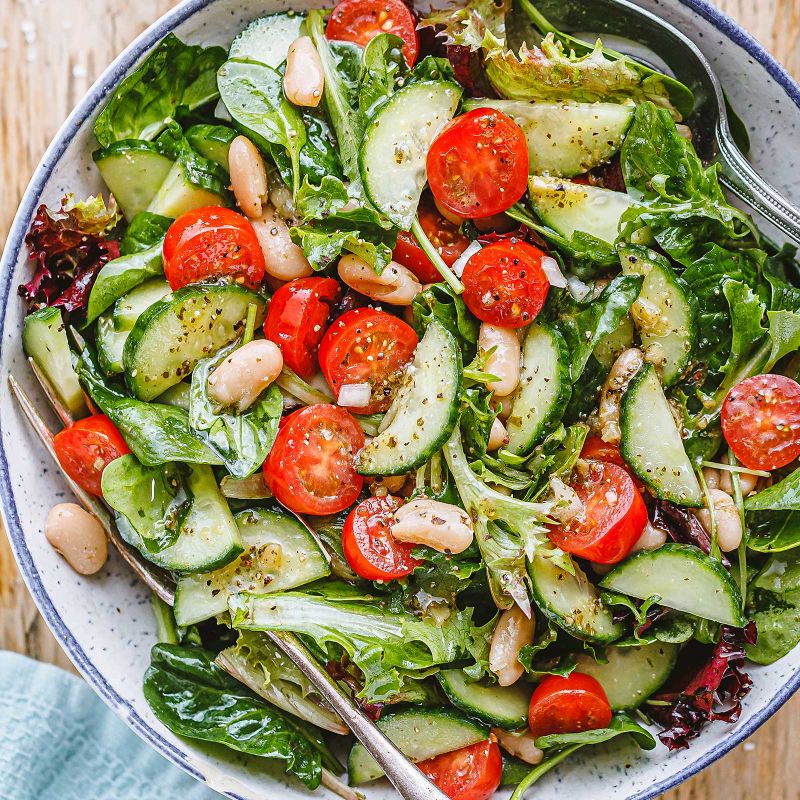 2. Add salad greens, white beans, onion, tomatoes, and cucumber to a large salad bowl or shallow plate. Pour the pesto dressing on top and toss to coat. Serve the white bean salad immediately or chill it in the refrigerator before serving. Enjoy! ❤️