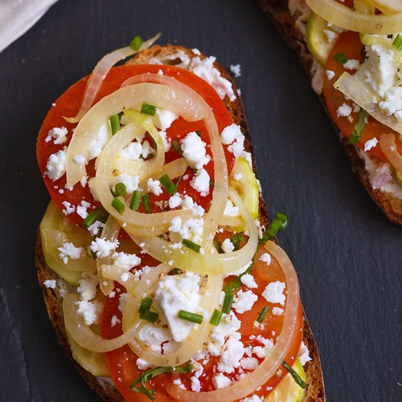 3. Spread the shallot, chives, and cream mixture onto slices of bread. Then add a layer of zucchini slices, then tomato slices, feta, and onion. Sprinkle with chives and fresh chopped basil leaves.